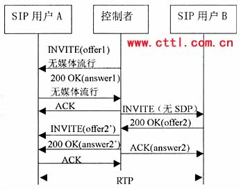 控制者再向B發(fā)送一個沒有SDP的INVITE。B應(yīng)答的200 0K響應(yīng)中包含一個提供offer2,控制者應(yīng)該基于offer2向A發(fā)送一個re-INVITE,注意。offer2可能需要稍作修改來滿足媒體要求。例如如果offer1包含一個音頻和一個視頻行,而offer2只有一個音頻行,控制者就需要在offer2中增加一個視頻行(端口設(shè)為O)來構(gòu)成offer2’。由于這是一個re-INVITE,所以通常應(yīng)該能立即收到響應(yīng)。A的200 0K響應(yīng)中包含的answer2’,可能也需要稍作修改作為offer2的應(yīng)答answer2?刂普呦駻發(fā)送ACK之后,媒體就可以流通。