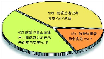 該調(diào)查收集了全球254名高級(jí)管理人員對(duì)未來企業(yè)網(wǎng)絡(luò)的意見和看法。其中,43%的受訪者表示,他們正在使用、測(cè)試或計(jì)劃在未來兩年內(nèi)實(shí)施VoIP;另外 18% 的受訪者表示,從長(zhǎng)遠(yuǎn)的角度來講,他們會(huì)實(shí)施 VoIP。市場(chǎng)預(yù)測(cè)也顯示相同的樂觀前景。研究機(jī)構(gòu)Gartner Dataquest預(yù)期到2008年,公用電話交換網(wǎng) (PSTN) 的零售語音收入將輕微下跌,而VoIP的零售收入則上升 38.6%。