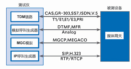 我們設計了一個呼叫測試。首先用被測設備搭建起一個完整的VoIP系統(tǒng),從模擬的語音開始,通過媒體網(wǎng)關(guān),再通過媒體網(wǎng)關(guān)控制器到另一個媒體網(wǎng)關(guān),最后從被叫方的一部模擬電話出來。