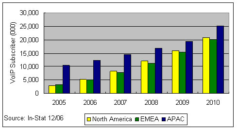 應(yīng)該說在2006年,VoIP技術(shù)已經(jīng)不是阻礙其市場(chǎng)發(fā)展的主要因素,因?yàn)镮n-Stat在全球個(gè)人VoIP消費(fèi)市場(chǎng)中作的調(diào)查顯示,約9%的VoIP用戶甚至不清楚自己在使用IP傳輸;有64%的用戶在使用免費(fèi)的VoIP服務(wù)。其次有超過73%的用戶并不把是否使用IP技術(shù)當(dāng)成選擇該業(yè)務(wù)的影響因素。而寬帶接入市場(chǎng)的競(jìng)爭(zhēng)則構(gòu)成了VoIP發(fā)展的關(guān)鍵因素,作為一種寬帶應(yīng)用,誰的接入資源占據(jù)了用戶家庭,誰就可以決定是否采用VoIP技術(shù)來提供語音業(yè)務(wù)。在歐洲法國Free Telecom與意大利的FastWeb都是三重播放業(yè)務(wù)的積極推進(jìn)者,在VoIP市場(chǎng)居領(lǐng)先地位;在日本Yahoo!BB擁有亞洲地區(qū)50%的寬帶VoIP用戶。幾乎所有這些寬帶ISP提供商往往采用包月的形式或者以極低的費(fèi)用提供無限制的本地或國內(nèi)通話,在國際長(zhǎng)途電話上提供極大的折扣。