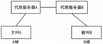 圖3給出了上述SIP消息選路過程。主叫A接入A域的代理服務器A后,代理服務器A查詢DNS,得到B域的代理服務器B的地址。最后由代理服務器B將invite消息發(fā)送至被叫B。在軟交換網(wǎng)絡中,代理服務器A和代理服務器B的功能都由軟交換機實現(xiàn)。