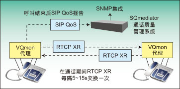 圖2顯示了如何在IP網絡上使用行業(yè)標準覆蓋質量管理系統(tǒng)。圖中顯示了嵌入式軟件探測裝置,如IP話機中的行業(yè)標準VQMon代理,它們可實時監(jiān)測通話質量。這些代理可生成RTCP