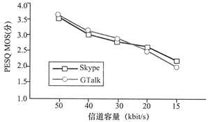 kbit/s時(shí),兩者間差異不大。當(dāng)信道容量為20 kbit/s時(shí),Skype首次優(yōu)于Gtalk,當(dāng)信道容量為15 kbit/s時(shí),Skype的PESQ