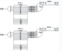 FIFO中的四幀數(shù)據(jù)被讀空時間大于第五幀的第一個字節(jié)寫入FIFO的準(zhǔn)備時間,F(xiàn)IFO的寫滿與讀空都是有硬件產(chǎn)生信號標(biāo)識,此時FIFO讀空信號標(biāo)識未產(chǎn)生,不能對同一FIFO進(jìn)行寫操作,導(dǎo)致待寫數(shù)據(jù)丟失。因此選用兩個FIFO采用乒乓機(jī)制來切換讀寫操作,如圖4所示!