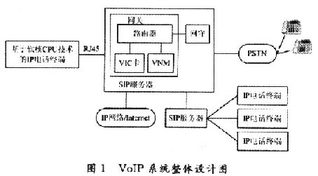 通過對國內(nèi)外VoIP技術(shù)的研究,要面向社會推廣價格低廉的IP電話業(yè)務(wù),普通用戶的電話終端成本,運營商的設(shè)備、管理成本都是必須考慮的因素。因此,設(shè)計出了一個VoIP系統(tǒng)方案,如圖1所示。