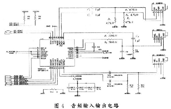 音頻輸入及編解碼電路是通過Wolfson公司的WM8731編解碼器(編碼器和解碼器)實現(xiàn)的。它可以提供高質(zhì)量的24b/s音頻,由一系列的I2C總線接口控制,這些接口連接到Cyclone II FPGA的引腳上。硬件電路如圖4所示。
