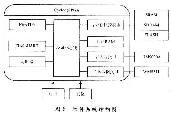 首先使用SOPC Builder系統(tǒng)工具構(gòu)建了一個NiosCPU作為整個系統(tǒng)的處理器核,它的Avalon總線對其他接口及控制器進行指令和數(shù)據(jù)傳輸,包括:由內(nèi)部定時器控制的Avalon總線;為Nios CPU配置了JATG通用異步收發(fā)器UART;為可選擇的片外存儲器配備了專用存儲器接口;控制語音輸入輸出的音頻數(shù)據(jù)接口,實現(xiàn)語音編解碼的控制和流處理;以太網(wǎng)接口負責(zé)CPU與DM9000A的數(shù)據(jù)收發(fā)和協(xié)議轉(zhuǎn)換。