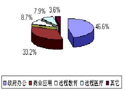 視頻會(huì)議系統(tǒng)在我國開始發(fā)展的初期,政府部門的應(yīng)用就占據(jù)了重要位置,覆蓋中央到直轄市和各省會(huì)城市的國家公眾視頻會(huì)議骨干網(wǎng)已經(jīng)完工。自1994年9月投入使用以來,國務(wù)院等機(jī)關(guān)先后利用該網(wǎng)召開了三百多次全國范圍的可視通訊會(huì)議。整個(gè)系統(tǒng)運(yùn)行情況良好,得到了國家領(lǐng)導(dǎo)人和各部委領(lǐng)導(dǎo)的高度贊揚(yáng)。近年來隨著電子政務(wù)工程的逐步推進(jìn),政府部門更加關(guān)注視頻會(huì)議系統(tǒng)建設(shè)。在經(jīng)濟(jì)發(fā)達(dá)地區(qū)(例如浙江、山東、廣東),視頻會(huì)議網(wǎng)已覆蓋到地市級(jí)城市,有的甚至覆蓋到縣一級(jí)。除各級(jí)政府之外,其它諸如檢察院、法院、公安和和水利等職能部門也是視頻會(huì)議系統(tǒng)的重要用戶。如圖1所示,政府辦公已占全部市場份額的46.6%。