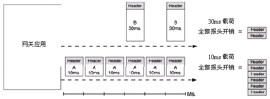 在一個(gè)減少發(fā)話方和受話方間音頻反應(yīng)時(shí)間的努力中,VoIP網(wǎng)關(guān)通常會(huì)配置成發(fā)送較小的語音數(shù)據(jù)載荷。雖然這樣做通?梢詼p少聽得見的傳輸延遲,但同時(shí)也增加了一個(gè)給定語音數(shù)據(jù)流需要傳遞的包的數(shù)量。因?yàn)椴还芏嘈〉囊纛l載荷都需要一個(gè)固定大小的包報(bào)頭,網(wǎng)上需要傳遞的數(shù)據(jù)量越大這個(gè)效果越明顯──跟隨的是網(wǎng)絡(luò)包和數(shù)據(jù)流量的相應(yīng)增長。圖1說明了用于傳輸包報(bào)頭的帶寬會(huì)隨著包載荷大小的縮小而增大。
