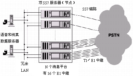 那兩個(gè)SS7節(jié)點(diǎn)是以冗余方式配置的,共享相同的信令點(diǎn)編碼,為所有的媒體節(jié)點(diǎn)提供呼叫控制。圖中所示的所有SS7鏈路采用單信令點(diǎn)編碼冗余方式備份,即使其中一個(gè) SS7節(jié)點(diǎn)出現(xiàn)故障,信令系統(tǒng)仍能繼續(xù)為呼入提供不中斷的語(yǔ)音信箱訪問。