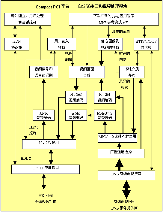右下方最粗的箭頭表示很多并行的廣播電視頻道,用戶可以從中選擇自己喜愛的某個頻道。中等大小的箭頭表示一個用戶的實時媒體流。最細的箭頭表示控制信息和非實時媒體傳送。由于到一個手機的視頻流所占用的帶寬比較小,音頻和視頻數(shù)據(jù)流可以做同樣的處理。對于擁有大量端口的系統(tǒng),設(shè)計時應(yīng)該讓在有線網(wǎng)和T1/E1中繼間的實時媒體流直接通過,而不要讓它們通過主處理器或PCI 總線。T1/E1中繼和有線電視的接口模塊可以合并,包括其中必須的視頻和音頻處理。但是,用于Compact PCI系統(tǒng)的、新的、高帶寬的交換結(jié)構(gòu)使得把這些功能分離成不同的模塊成為可能,免除媒體通過PCI總線的必要。