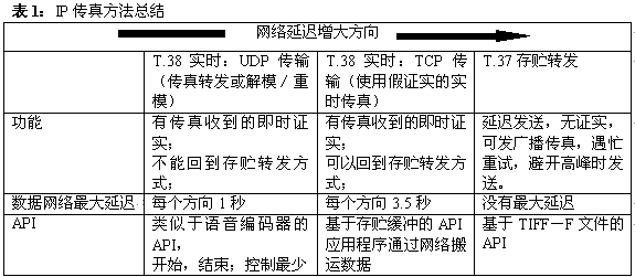 IP傳真方法的一個總結(jié)顯示于表1之中。通過選擇功能、業(yè)務(wù)需求以及所用網(wǎng)絡(luò)的延遲,就能得出最適合指定應(yīng)用的傳真方法。