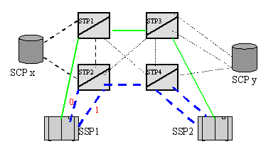 如下圖所示,藍(lán)色的五條鏈路組成SSP1到SSP2的路由1,綠色的三條鏈路組成SSP1到SSP2的路由2。路由1和路由2組成SSP1到SSP2的路由集。