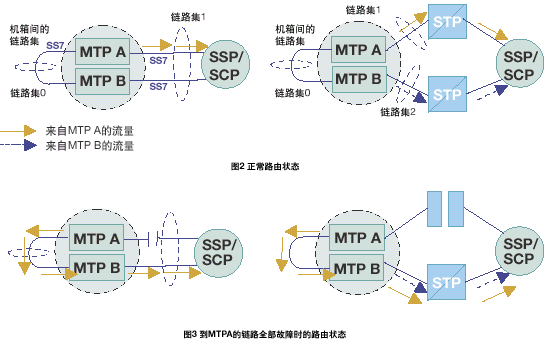 當(dāng)連接到MTP A或連接到 MTP B的所有鏈路均發(fā)生故障時,訊息通過MTP A和MTP B之間的鏈路集發(fā)送到其它MTP,并由該MTP在可用的鏈路上重新發(fā)送。參見圖3。