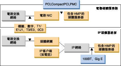 模塊化的下一代網(wǎng)絡(luò)將語音和數(shù)據(jù)合并在單個(gè)包基礎(chǔ)結(jié)構(gòu)中。這使目前的兩種主要架構(gòu)可用于部署媒體服務(wù);基于直通電路的網(wǎng)絡(luò)接口和基于包的IP網(wǎng)絡(luò)接口。下面的圖說明了這兩種架構(gòu)。Dialogic HMP軟件可在這兩種架構(gòu)中提供媒體處理。