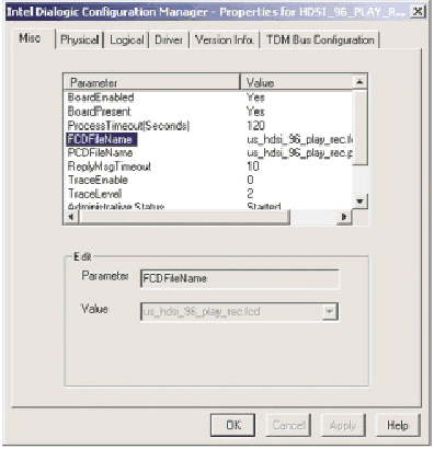當(dāng)一個(gè)config文件被修改時(shí),<INSTALL DIRECTORY>\Dialogic\Bin\fcdgen 工具必須用修改過的或者新的config文件的位置和名字執(zhí)行。這個(gè)工具會(huì)創(chuàng)建一個(gè)新的FCD文件,該文件必須在配置管理列表中相應(yīng)板卡的FCD文件Name域上詳細(xì)說明.例見圖2.