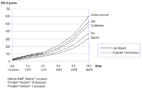 Dialogic 編制的HMP軟件,在Dialogic的從566 MHz 到 2 GHz的Celeron® 和 Pentium® 處理器上,已經(jīng)對(duì)語音宣告、IVR和會(huì)議算法完成了實(shí)現(xiàn)、優(yōu)化和測(cè)試。圖1中的實(shí)線表示實(shí)驗(yàn)室中的測(cè)試結(jié)果。Dialogic的目標(biāo)是實(shí)現(xiàn)這些算法,并擴(kuò)展到更高速的Dialogic® Pentium® 處理器,雙路、四路、甚至八路Dialogic® Pentium® 處理器,Dialogic® Xeon® 處理器、以及Dialogic® Itanium® 處理器。圖1中的虛線顯示了Dialogic所期望的在未來的實(shí)現(xiàn)中將得到的結(jié)果。
