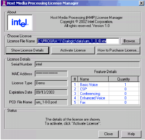 2. 如果HMP許可證管理器GUI沒有在屏幕上,可通過開始 > 程序> Dialogic HMP 1.0 > HMP 許可證管理器訪問它。.