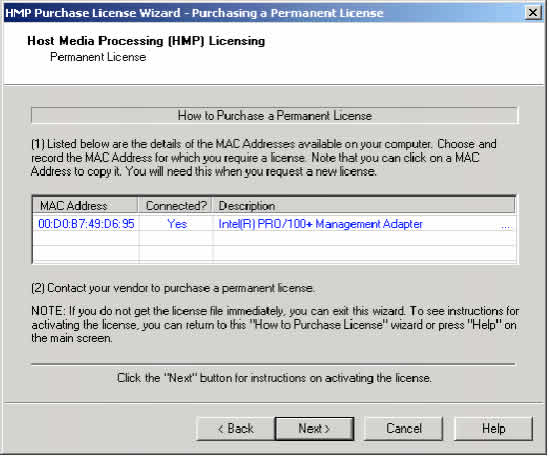 • 購(gòu)買并激活一個(gè)永久的HMP 許可證. 可通過打開HMP許可證管理器,具體方法為:開始> 程序> Dialogic NetStructure HMP 1.0 > HMP許可證管理器:參見第4章"主機(jī)媒體處理軟件的許可證程序"。